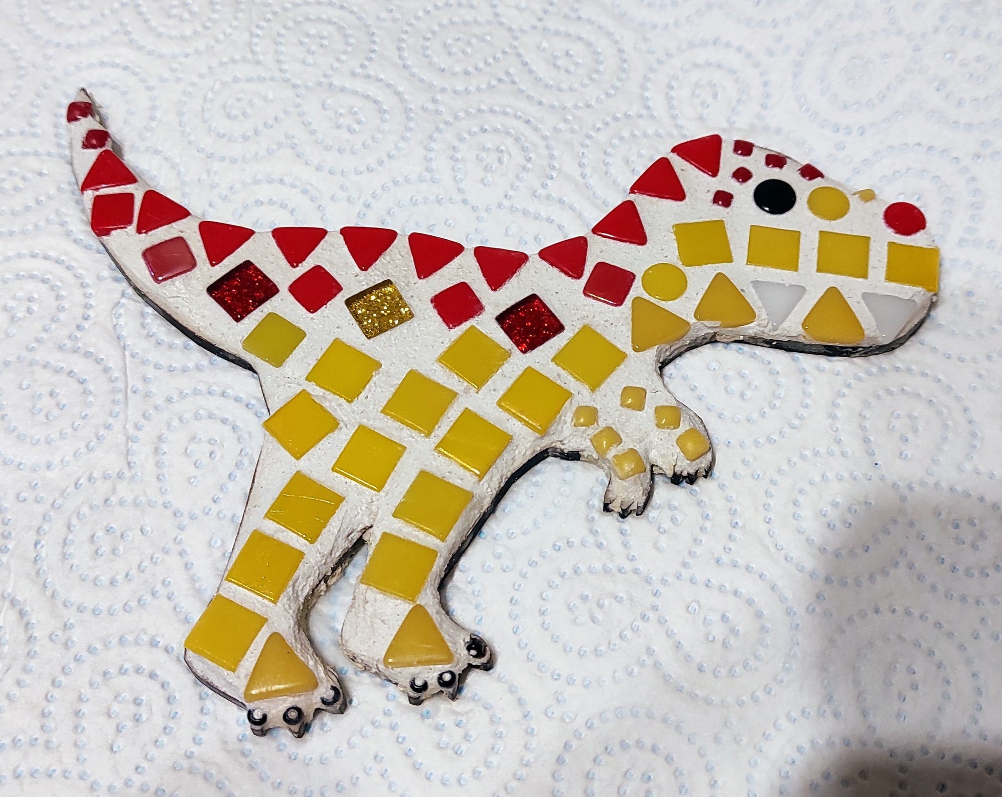 Each kit contains a 15cm T-Rex template, pot of glue and glue spreader, bag of white powdered grout, a bag of beautiful high quality mosaic tiles in a mix of shapes and sizes in any colour combination you choose and full instructions.